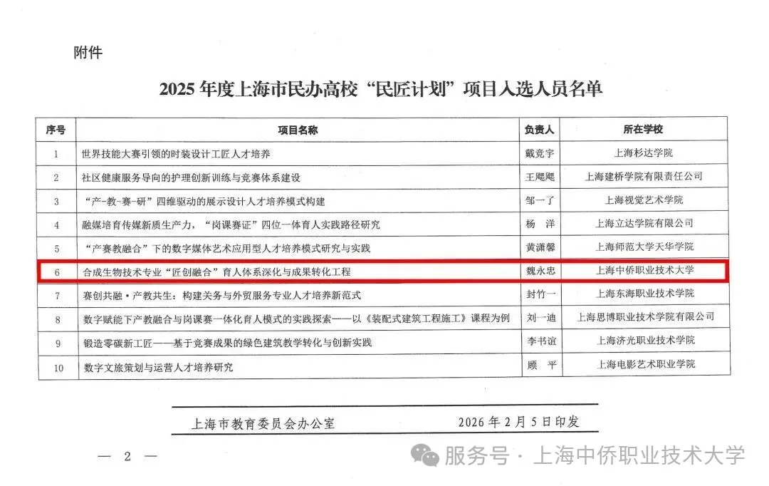 Recently, the Shanghai Municipal Education Commission officially announced the list of selected candidates for the 2025 “Minjiang Plan” for private universities in Shanghai. The project titled “Deepening the Integration of Craftsmanship and Innovation in the Education System of Synthetic Biotechnology and Promoting the Transformation of Its Outcomes,” led by Wei Yongzhong, Deputy Secretary of the Party Branch of the Zhongqiao–Helsinki School of Future Engineering at Shanghai Zhongqiao Vocational and Technical University, has been successfully selected. This recognition highlights the university’s solid foundation and ongoing exploration in program development and innovation in talent cultivation models.